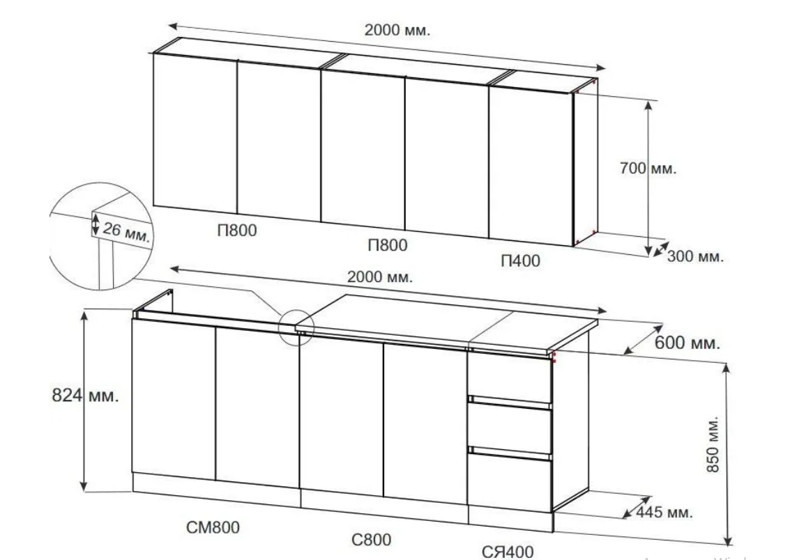 Комплектация: Кухонный гарнитур 2000 мм., столешница, цоколь, фурнитура