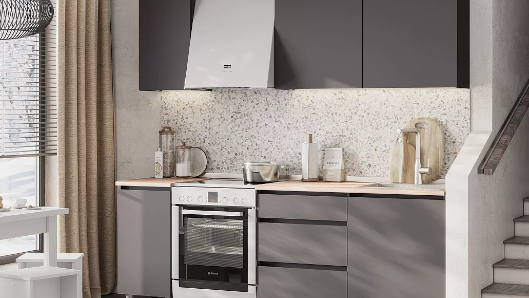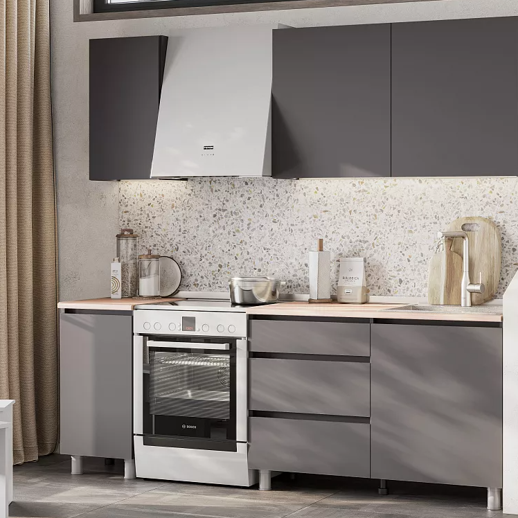 Однотонные матовые фасады приятного оттенка Графит серый не имеют лицевой фурнитуры, что придаёт мебели уникальный стиль.