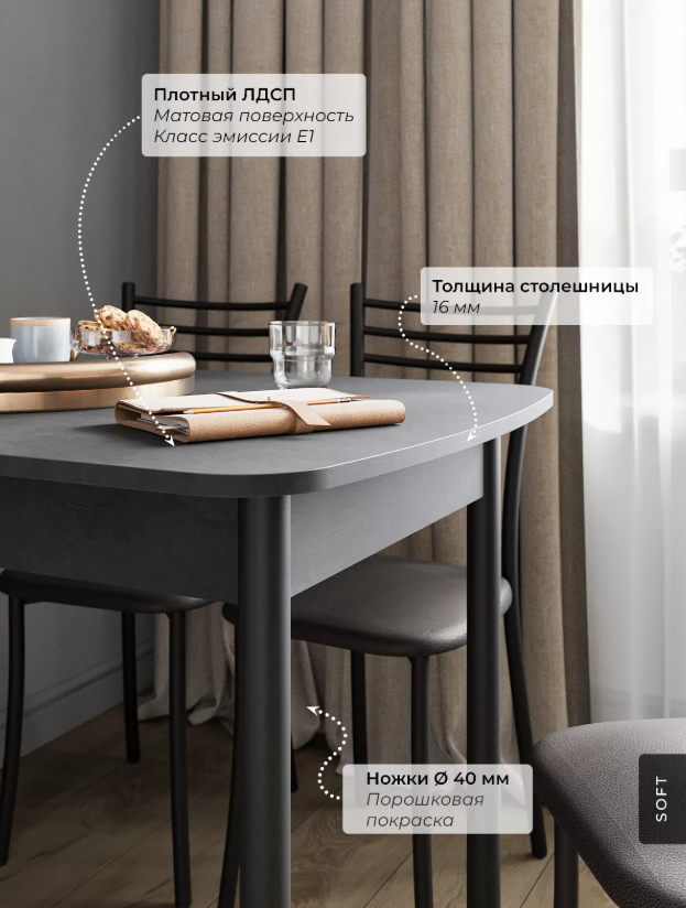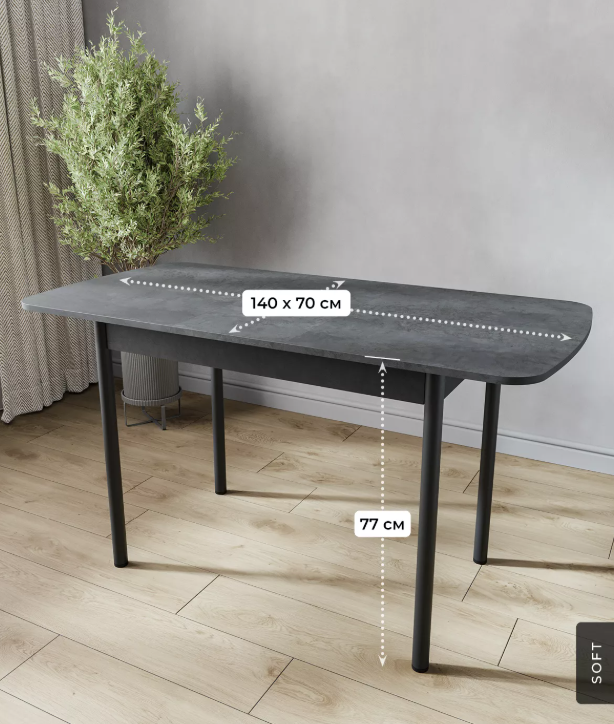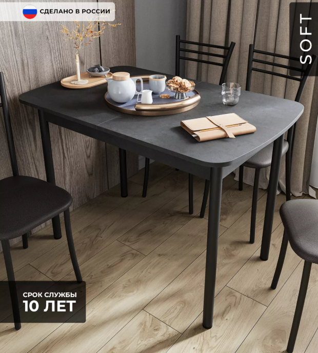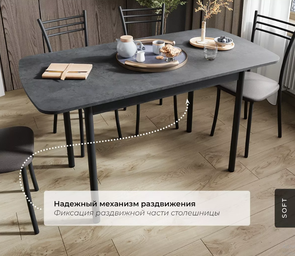- Оптимизация пространства: Стильный раздвижной механизм позволяет увеличить площадь столешницы на дополнительные 300 мм, обеспечивая комфортное размещение гостей или удобное рабочее место.