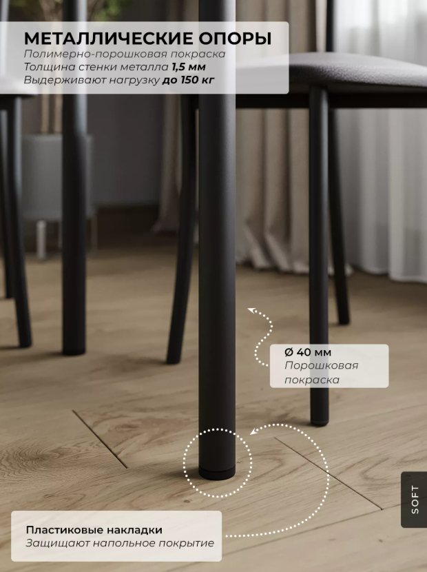 - Качество изготовления: Металлические опоры покрыты полимерно-порошковым покрытием черного цвета, защищающим материал от коррозии и повреждений.