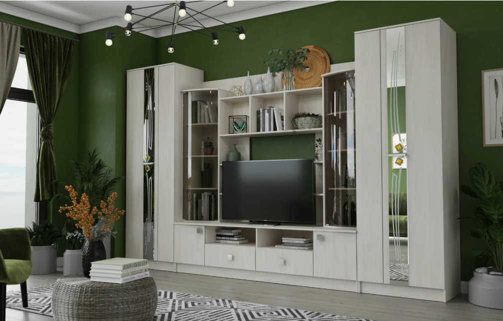 Гостиная «Венеция» – идеальный вариант для размещения большого количества вещей, включая одежду, ведь данная модель имеет зоны для ее хранения. ТВ-зона, выдвижные ящики, ниши для техники и открытые полки гармонично вписаны в дизайн гостиной.