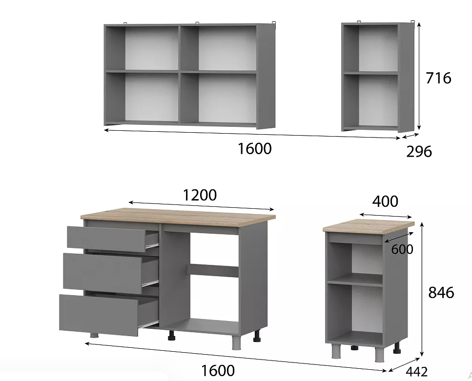 • Габариты модулей низ (ШхВхГ) - 1600х820х442 мм (без столешницы) / 1600х846х600 (со столешницей).