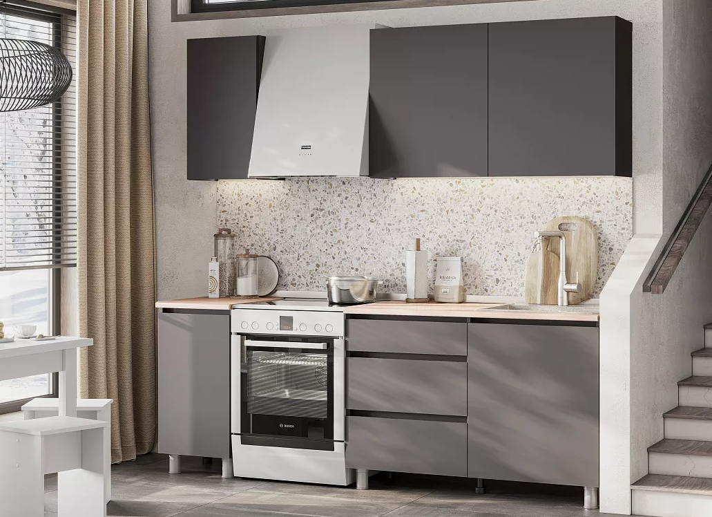 Однотонные матовые фасады приятного оттенка Графит серый не имеют лицевой фурнитуры, что придаёт мебели уникальный стиль.